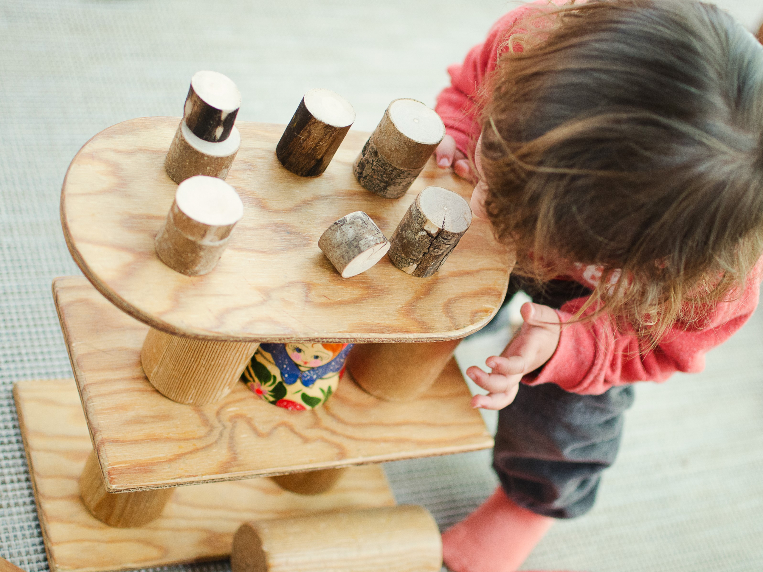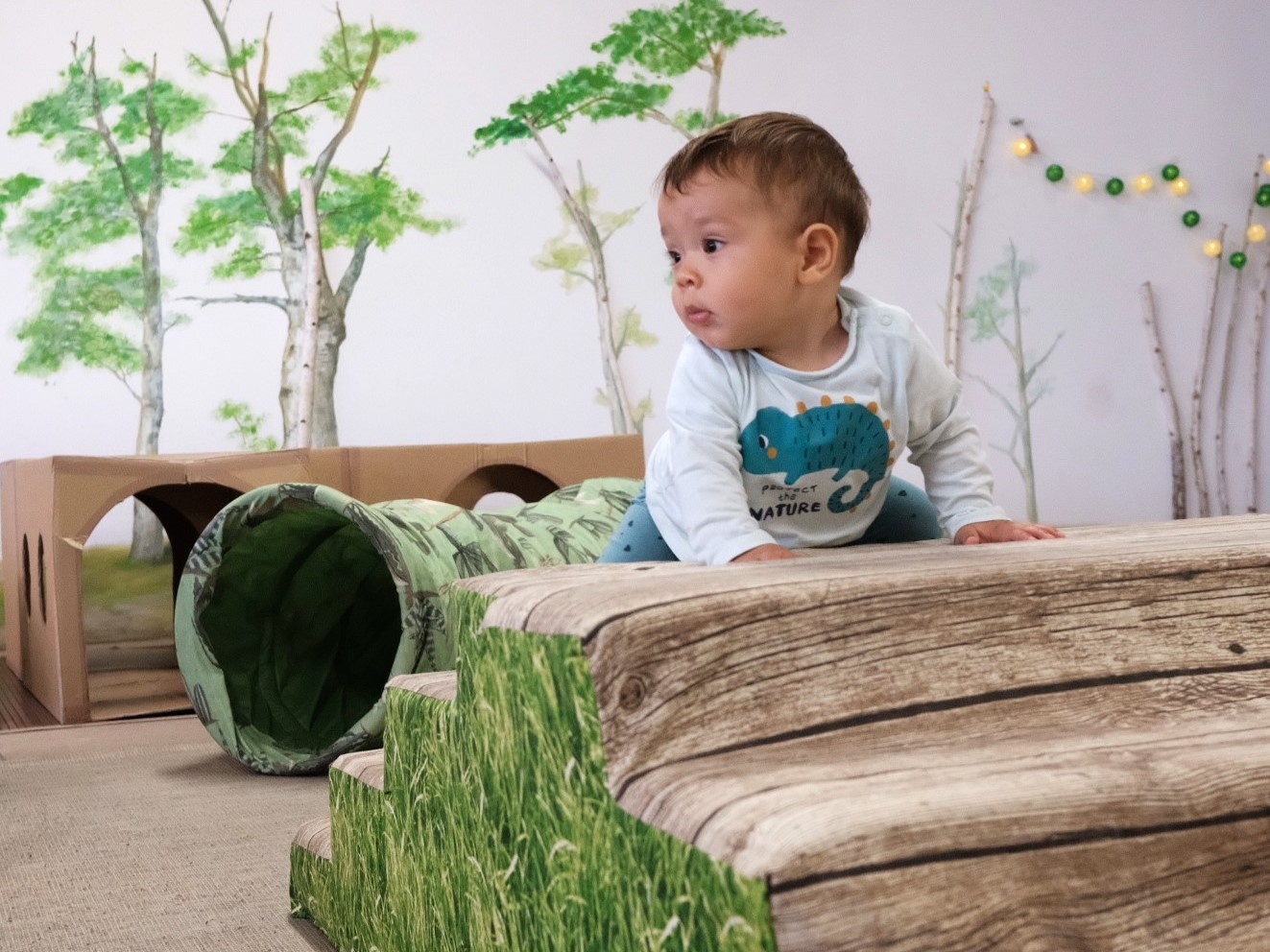 estructuras que facilitan el placer del suelo, de rodar, de gatear… rampas en las que subir, túneles que traspasar, lugares para esconderse y desaparecer, espejos en los que reconocerse, luces con las que jugar, lugares para mecerse… en un ambiente respetuoso, esencial para que niños y niñas se desenvuelvan libremente y descubran poco a poco. El adulto que acompaña al bebé le observa, le facilita algo si lo necesita, juega con él… pero si no le necesita, le deja jugar.