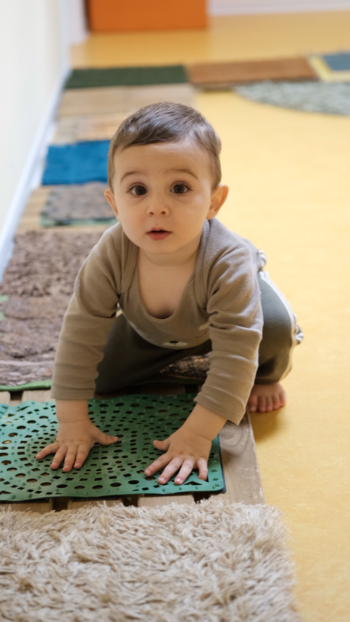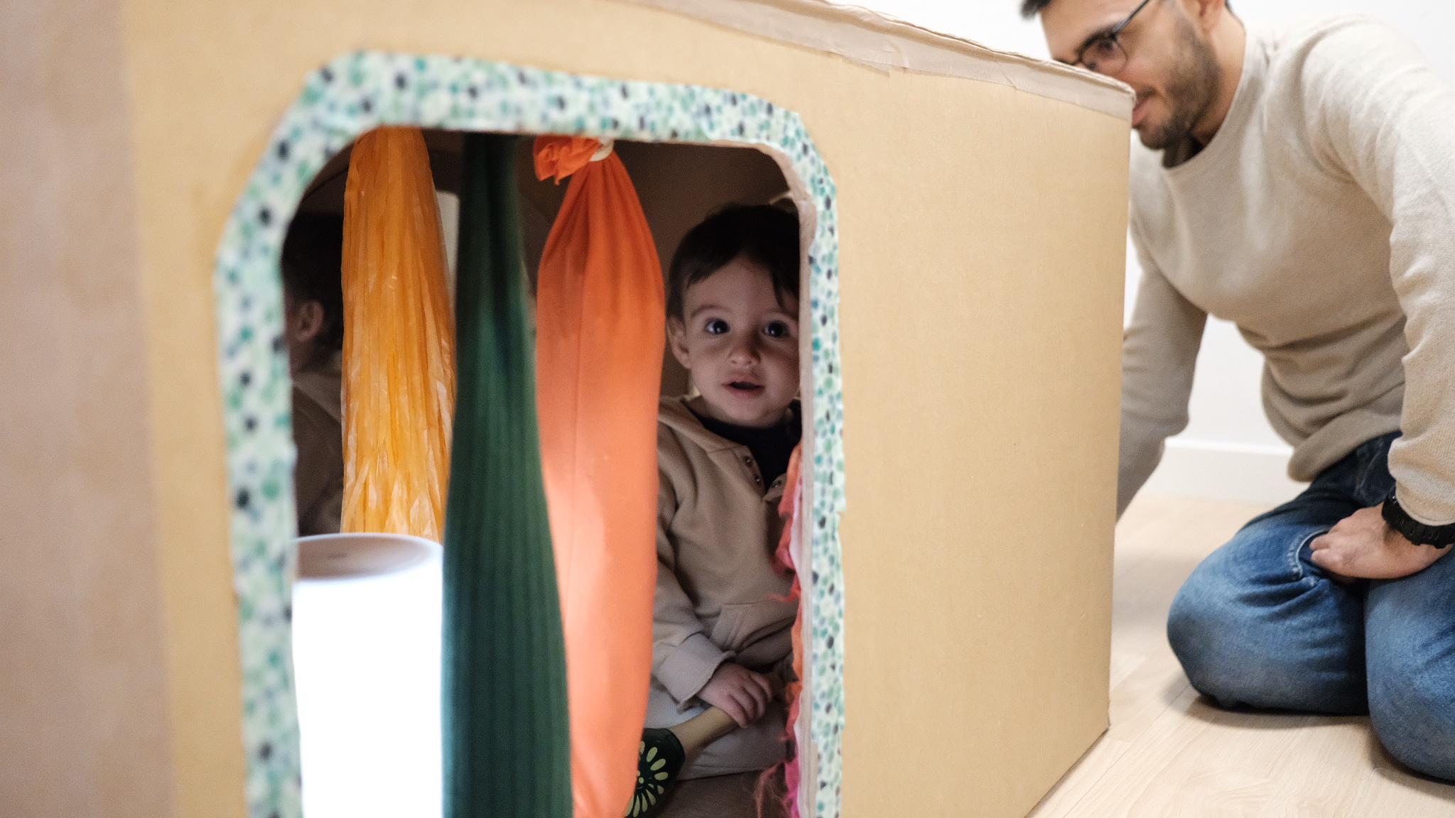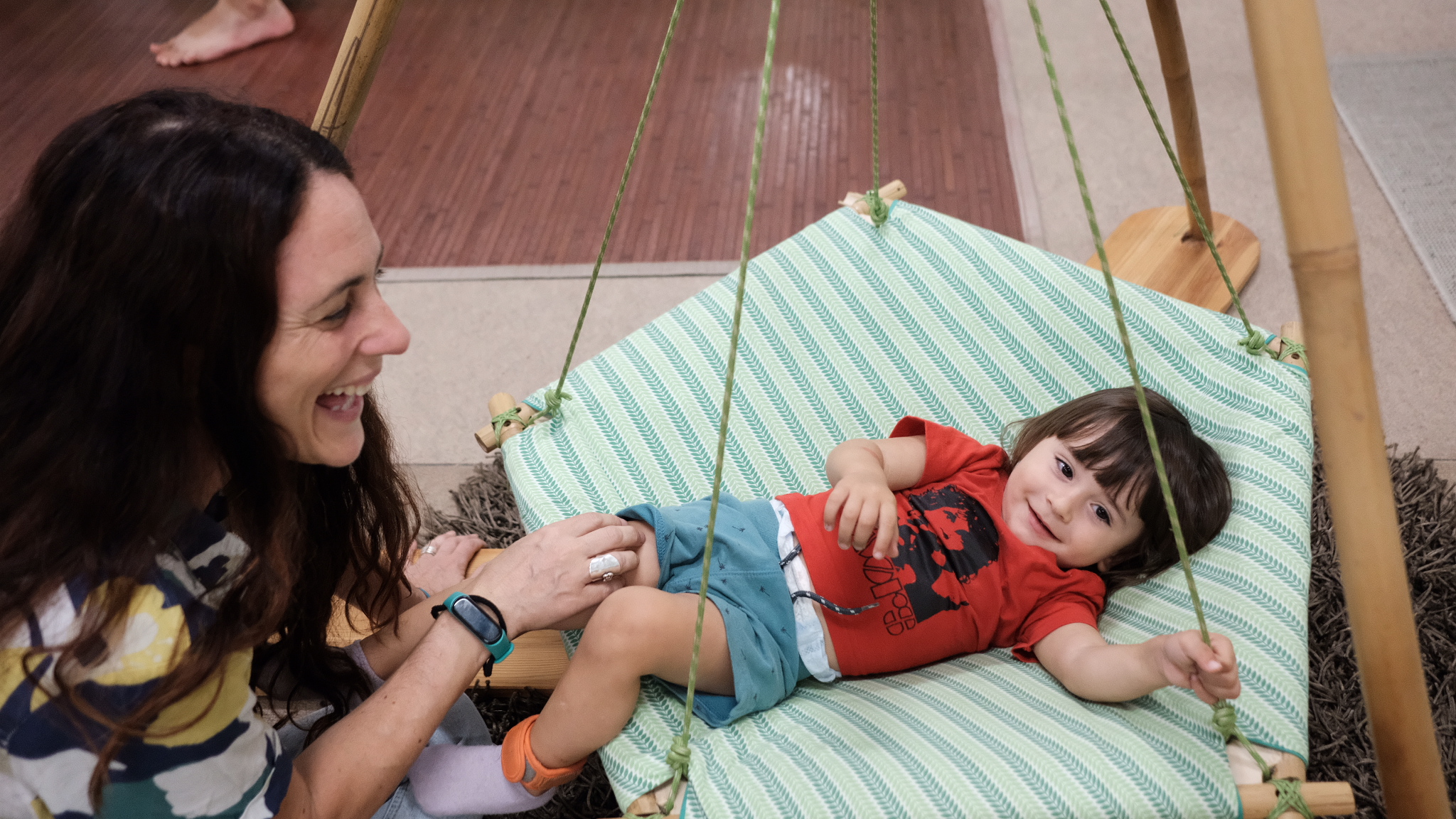 Hay estructuras que facilitan el placer del suelo, de rodar, de gatear… rampas en las que subir, túneles que traspasar, lugares para esconderse y desaparecer, espejos en los que reconocerse, luces con las que jugar, lugares para mecerse… en un ambiente respetuoso, esencial para que niños y niñas se desenvuelvan libremente y descubran poco a poco. El adulto que acompaña al bebé le observa, le facilita algo si lo necesita, juega con él… pero si no le necesita, le deja jugar.