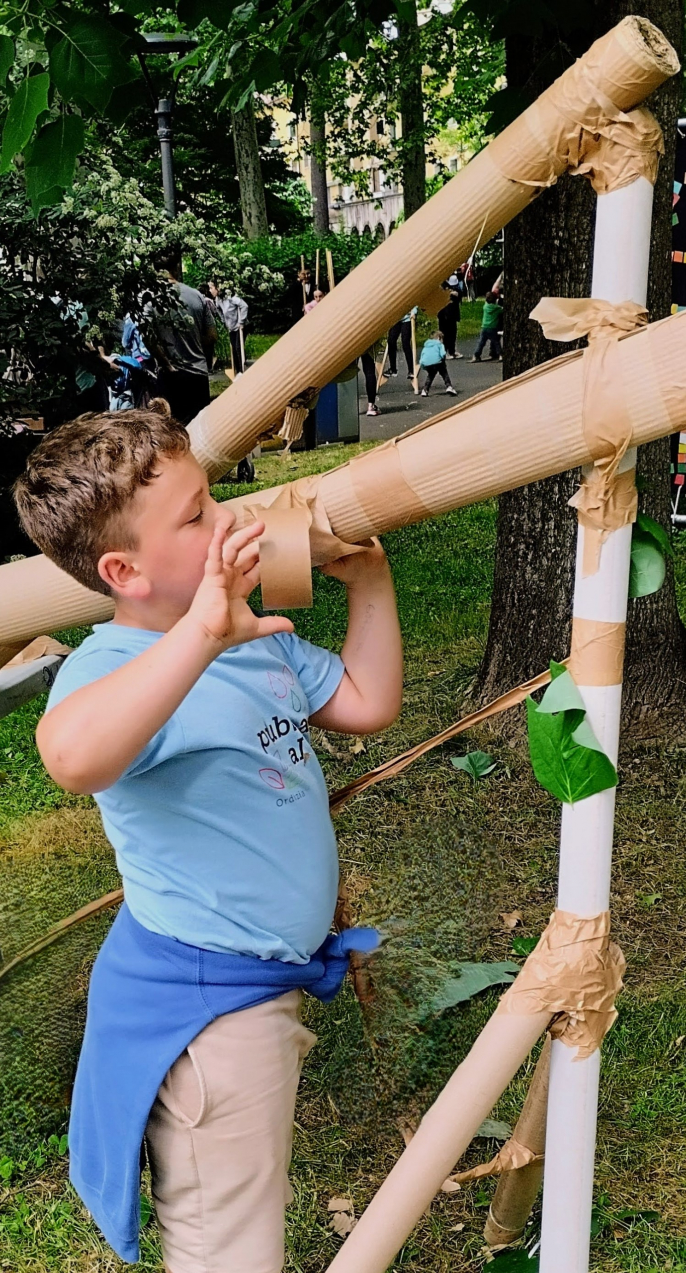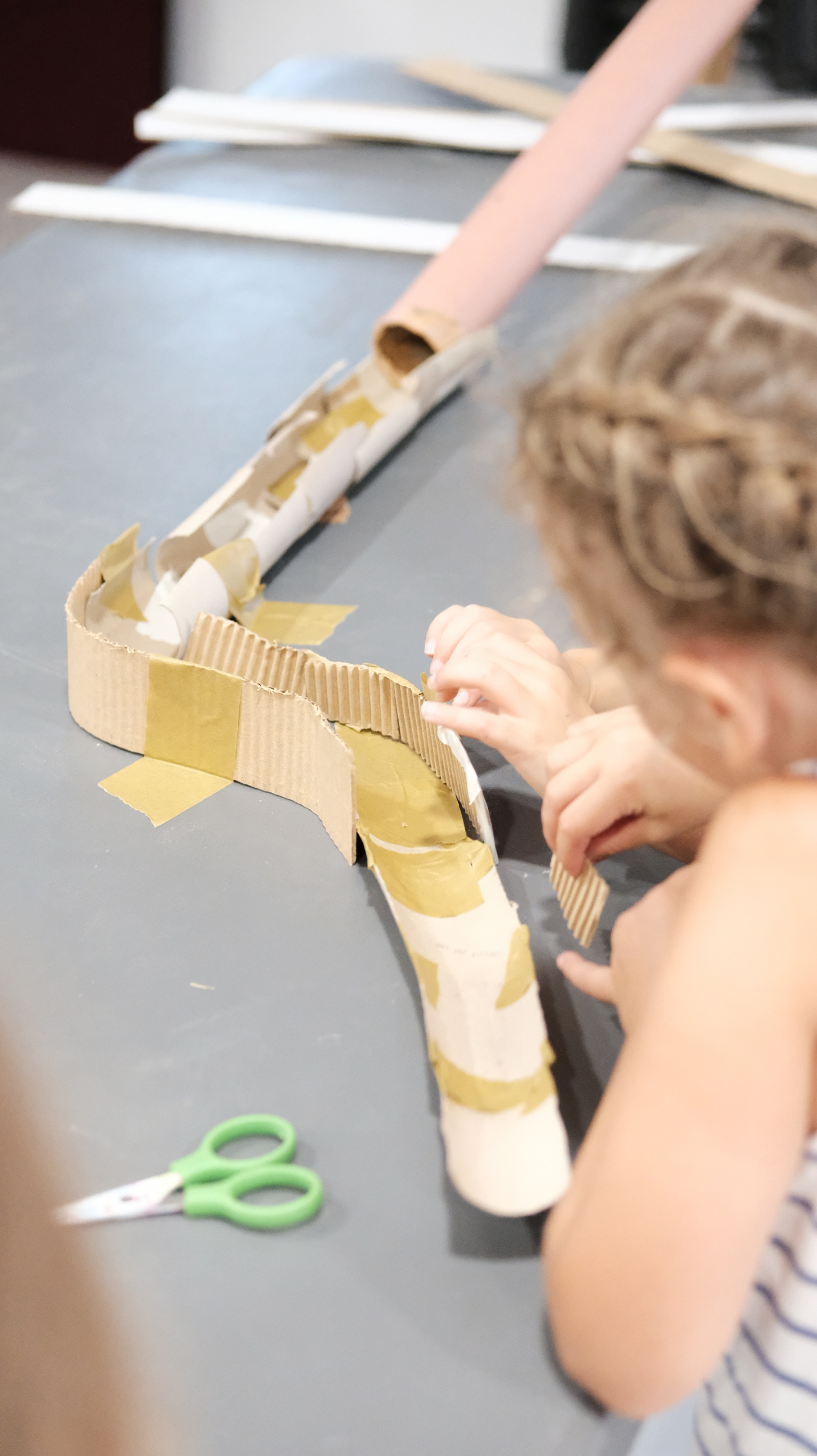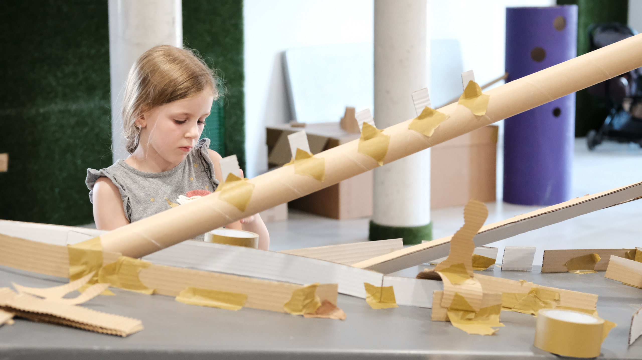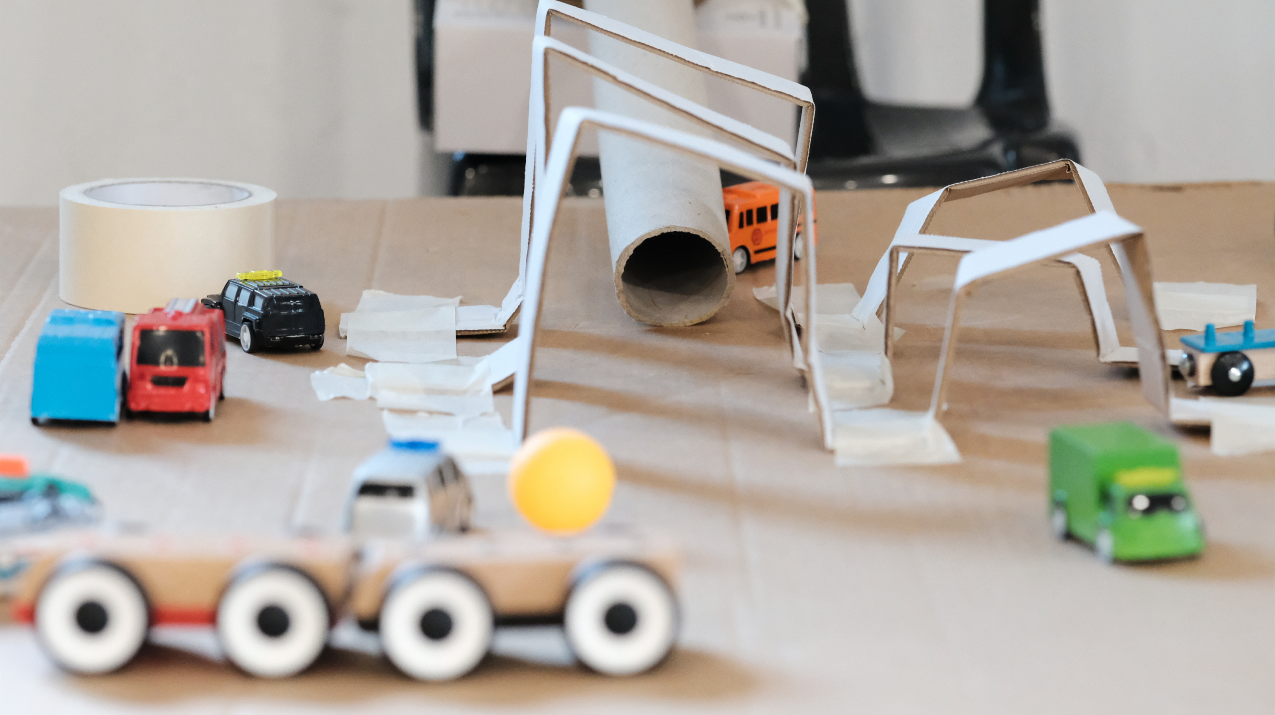 Cartones de diferentes tamaños y procedencias son la materia prima para construir circuitos: los circuitos son los caminos por donde se deslizarán las bolas que atraviesan calles, puentes, túneles y todo aquello que quieran construir las personas participantes.