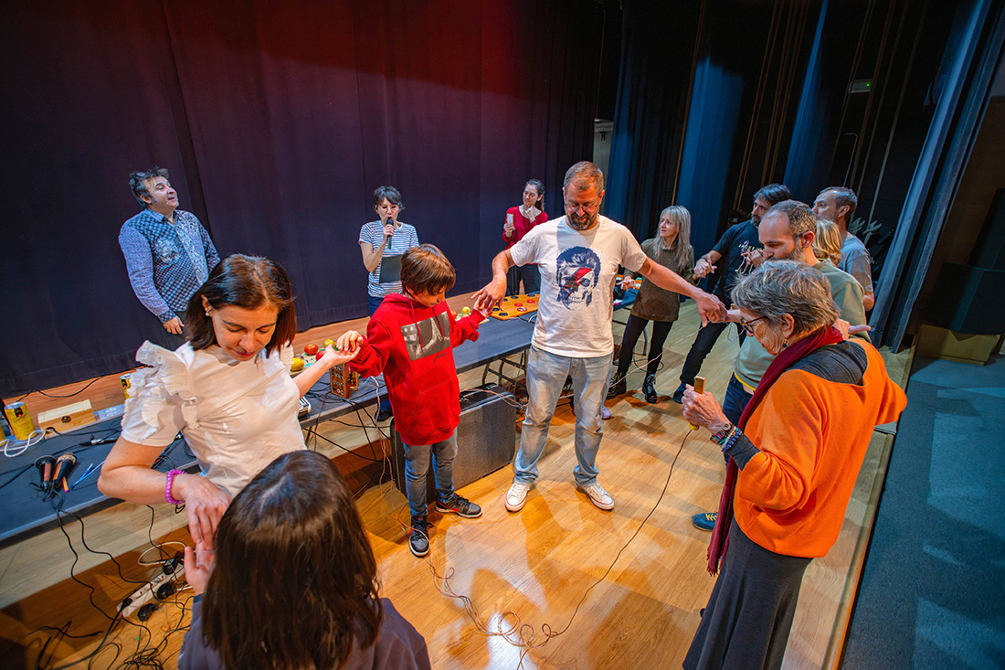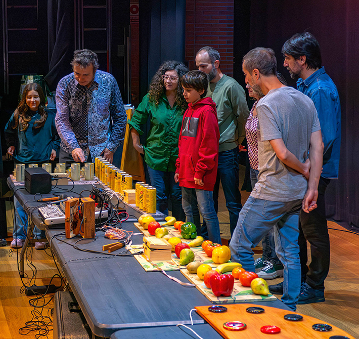 Los instrumentos están en escena. Se explica su funcionamiento técnico y musical. El público sale a tocarlos y ¡suenan bien afinados y armónicos!